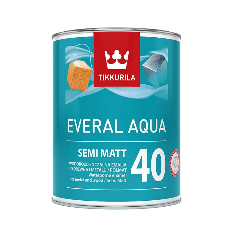 TIKKURILA Everal Aqua Semi-Matt40 to najnowszej generacji, uniwersalna emalia akrylowa o delikatnym zapachu, która tworzy półmatową powłokę. Jest przeznaczona do malowania zarówno wewnątrz, jak i na zewnątrz pomieszczeń.