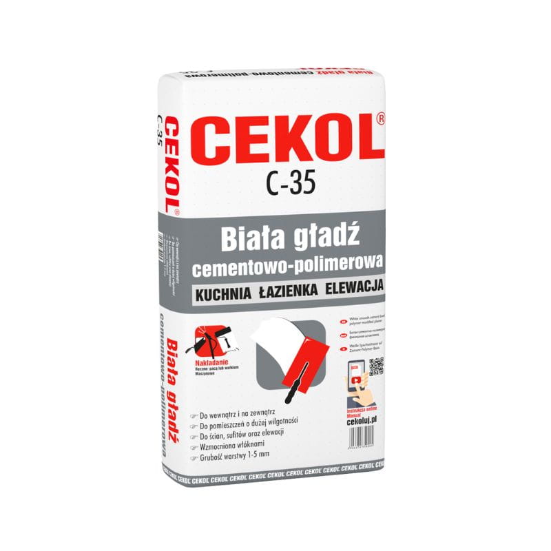 CEKOL C-35 cechuje się wodoodpornością i odpornością na mróz. Składa się z mieszanki wysokiej jakości białego cementu, białych wypełniaczy mineralnych i modyfikujących składników, zapewniających doskonałą przyczepność do podłoży mineralnych, takich jak beton czy cegła. Jest to idealny podkład pod różne rodzaje farb, co umożliwia osiągnięcie pożądanego efektu kolorystycznego przy ograniczonej ilości warstw. CEKOL C-35 rekomendowany jest jako warstwa zewnętrzna w systemach ociepleń ETICS.