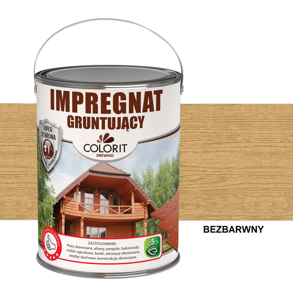 Impregnat gruntujący przeznaczony jest do konserwacji i ochrony elementów drewnianych na zewnątrz. Polecany w szczególności do drewnianych płotów, bram, palisad, konstrukcji stropów i dachów, drzwi, altanek, domków letniskowych, pergoli oraz innych elementów architektury ogrodowej. Zalecany jako pierwsza warstwa gruntująco - ochronna. Impregnat nie nadaje koloru i może być stosowany pod następujące produkty: lakier, lakierobejcę, olej, impregnat koloryzujący. Posiada super właściwości ochronne przed grzybami, mchem i glonami. Zabezpiecza drewno przed niekorzystnymi warunkami atmosferycznymi i środowiskowymi, w tym promieniowanie UV. Impregnat głęboko wnika w strukturę drewna oraz skutecznie chroni zaimpregnowaną powierzchnię.
