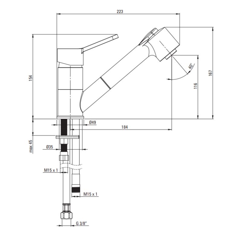 Wylewka: materiał – metal, rodzaj – wyciągana, zasięg – 184 mm