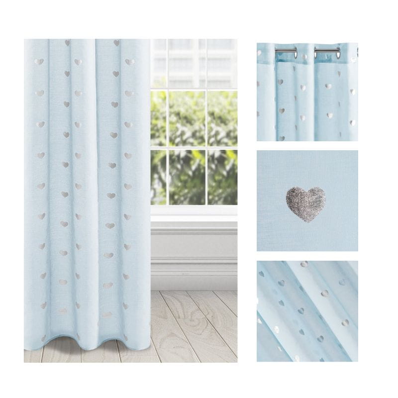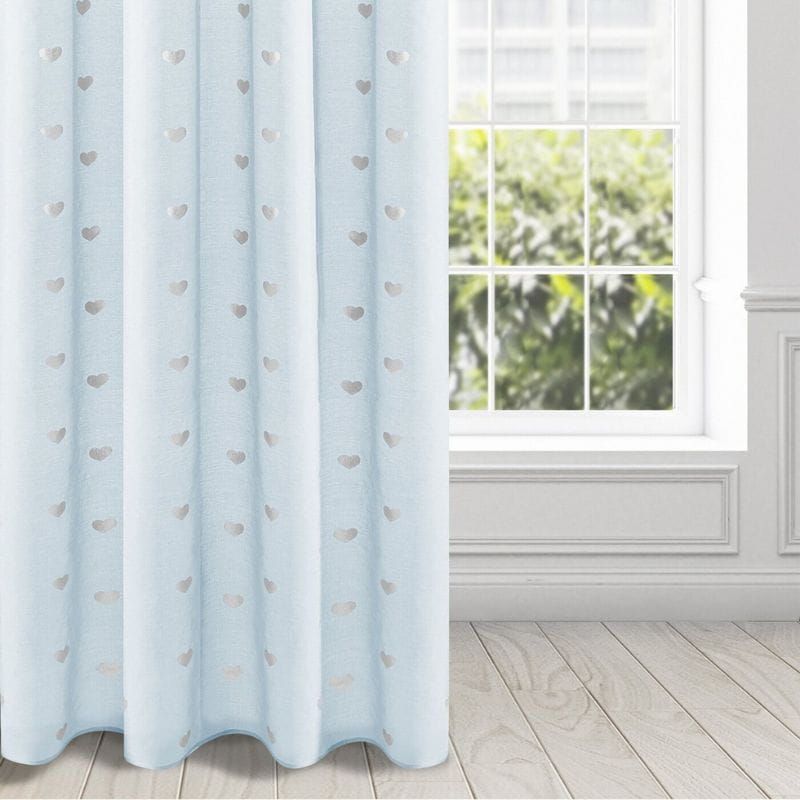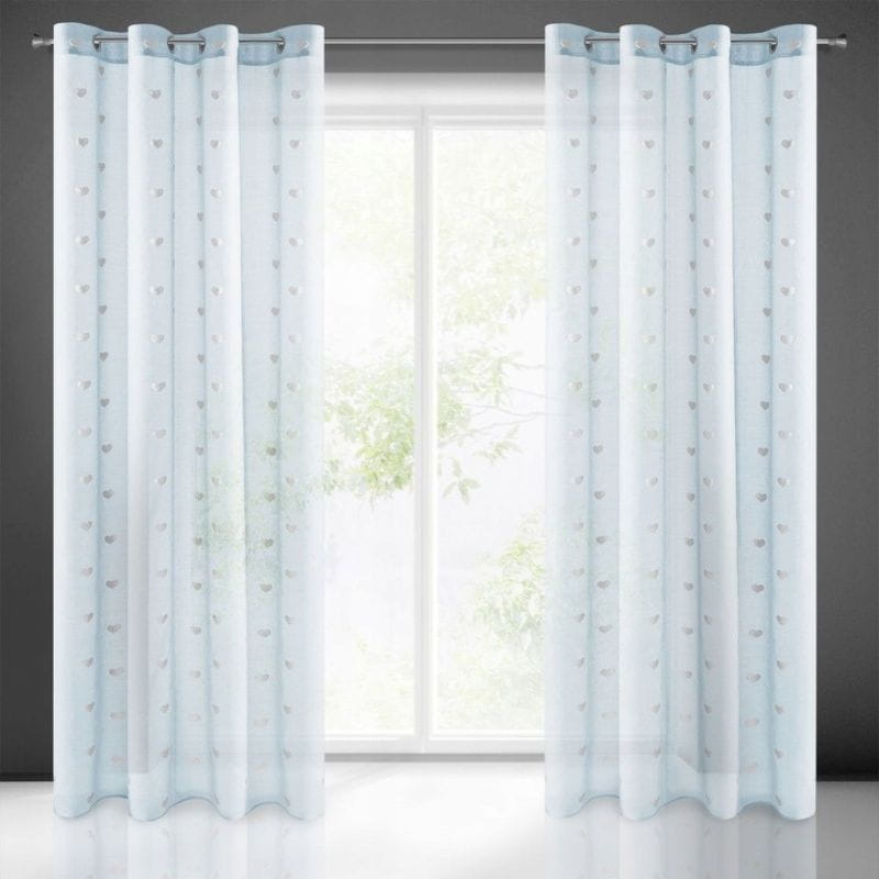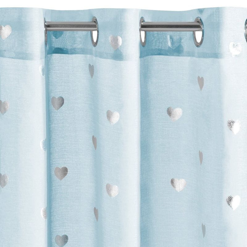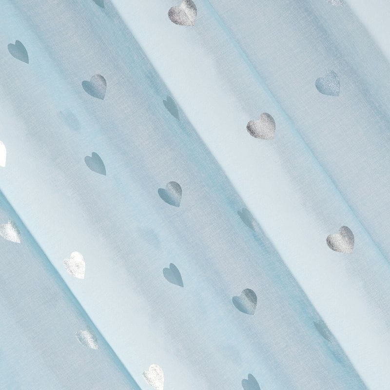 Błękitna, półtransparentna firana z nadrukiem w postaci srebrnych serduszek to urocza propozycja do pokoju dziecka czy nastolatki, ale nie tylko! Sprawdzi się wszędzie tam, gdzie chcemy wprowadzić przytulny i romantyczny klimat. Mocowana na praktyczne przelotki, układa się w miękkie, równe fale.