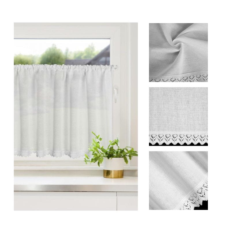 Zazdrostka w stylu rustykalnym wykonana z białej matowej tkaniny z przewagą bawełny. Wykończona elegancką koronką jest uroczą ozdobą okna. Zazdrostka posiada tunel, co ułatwia zamontowanie jej na drążku.