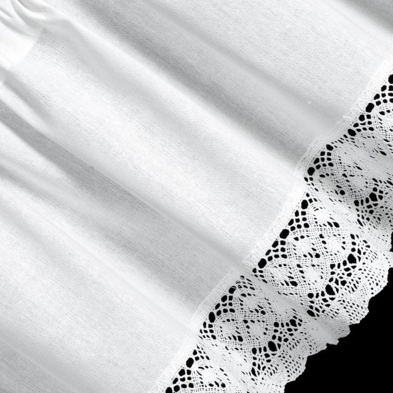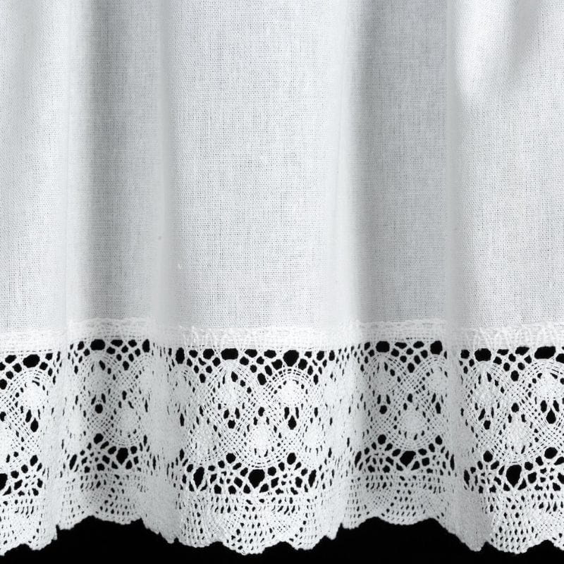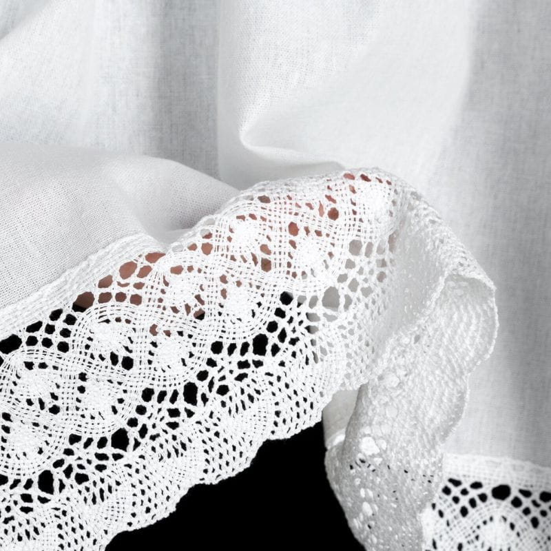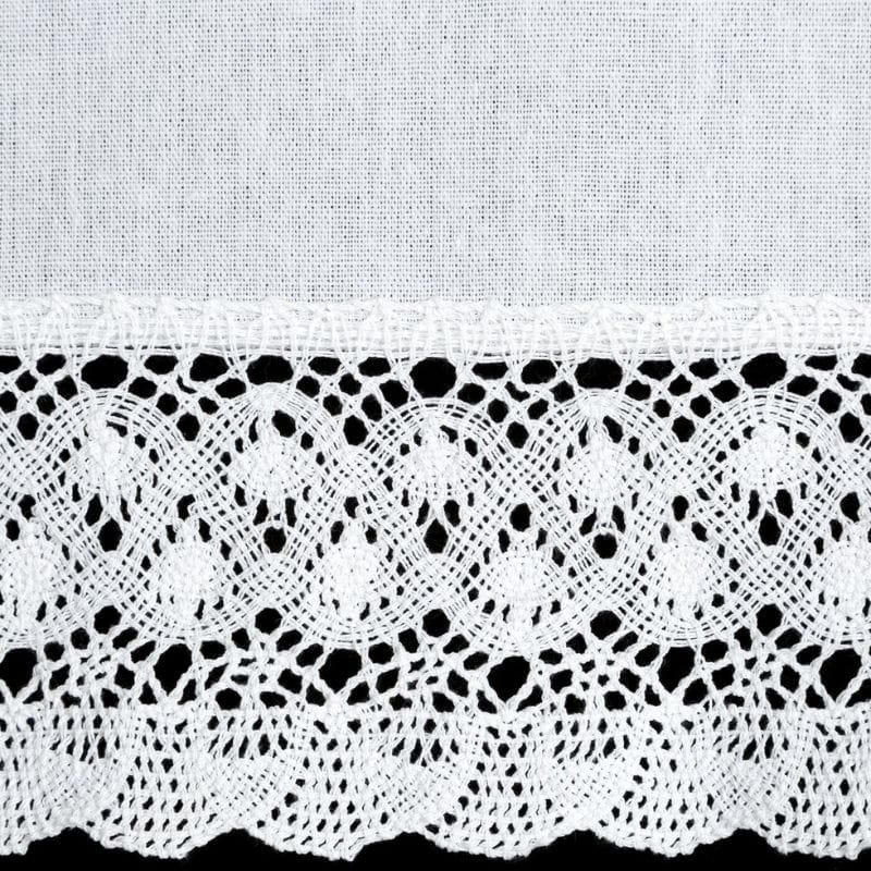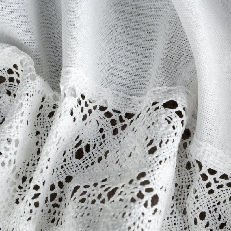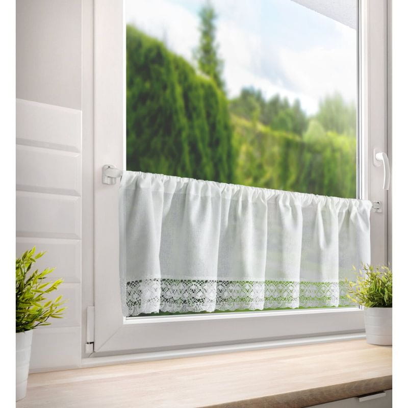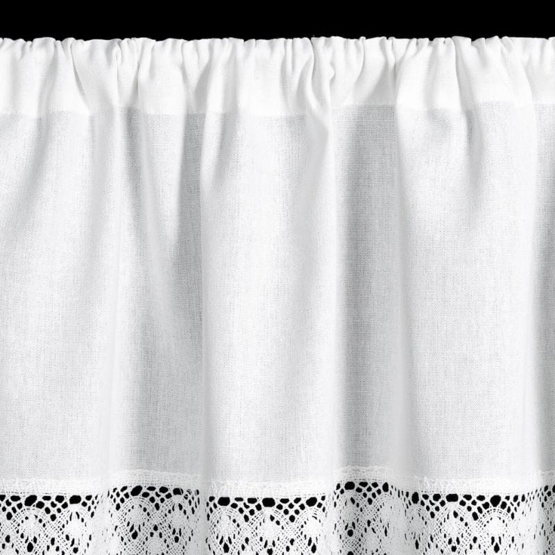 Krótka zazdrostka w stylu rustykalnym wykonana z białej matowej tkaniny z przewagą bawełny. Wykończona elegancką koronką jest uroczą ozdobą okna. Zazdrostka posiada tunel, co ułatwia zamontowanie jej na drążku.
