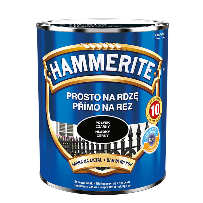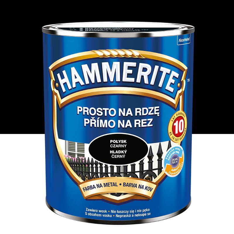 Hammerite Prosto Na Rdzę – połysk – to nowoczesna, jednoskładnikowa farba, schnąca na powietrzu, przeznaczona do antykorozyjnego i dekoracyjnego malowania metali żelaznych (stal, żeliwo), zarówno tych pokrytych rdzą, jak i czystych. Może być również stosowana do zabezpieczenia metali nieżelaznych po odpowiednim zagruntowaniu. Wykończenie w efekcie gładki połysk zapewnia niepowtarzalne walory estetyczne i długotrwałą ochronę antykorozyjną.