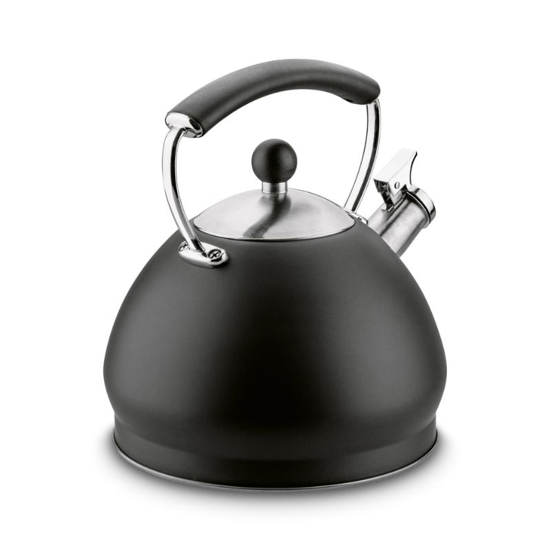 Pozostała informacja: czajnik ze stali nierdzewnej malowany proszkowo, wykończenie matowe; pokrywka stalowa z przykręcanym uchwytem bakelitowym; średnica wlewu 9,5 cm; rączka zamknięta, bakelitowa; gwizdek stały