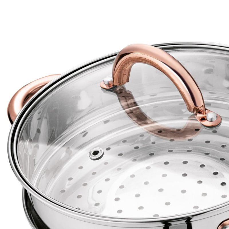 Pozostałe informacje: garnek oraz wkład do gotowania na parze ze stali nierdzewnej; uchwyty stalowe w kolorze miedzianym, stylizowane na różowe złoto, nitowane; pokrywka szklana ze stalowym rantem i odpowietrznikiem; wysokość garnka: 9,5 cm; wysokość wkładu: 7 cm; wysokość garnka z wkładem bez pokrywy: 14 cm; tylko mycie ręczne