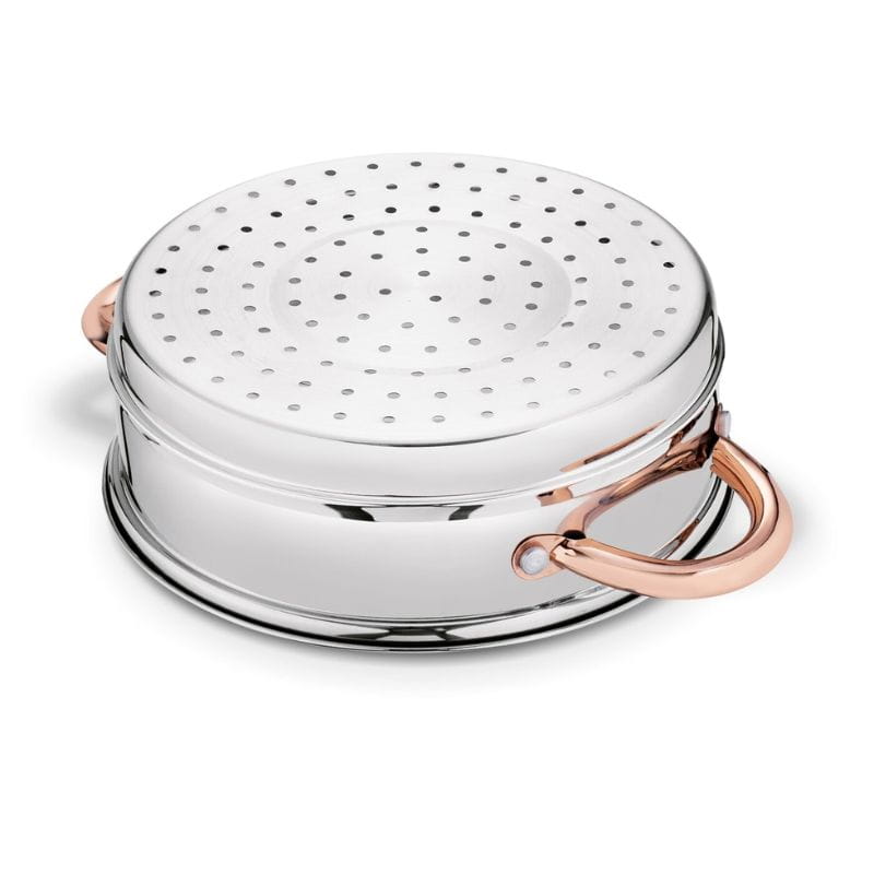 Garnek do gotowania na parze KonigHOFFER Faro Copper o pojemności 2,9 litra to funkcjonalne naczynie kuchenne, które łączy wygodę użytkowania z troską o zdrowe odżywianie. Dzięki specjalnemu wkładowi z sitkiem, przygotujesz warzywa, mięso, ryby czy pyzy w sposób, który zachowuje ich smak, kolor i cenne wartości odżywcze. Gotowanie na parze pozwala uniknąć tłuszczu i ogranicza utratę witamin oraz mikroelementów.