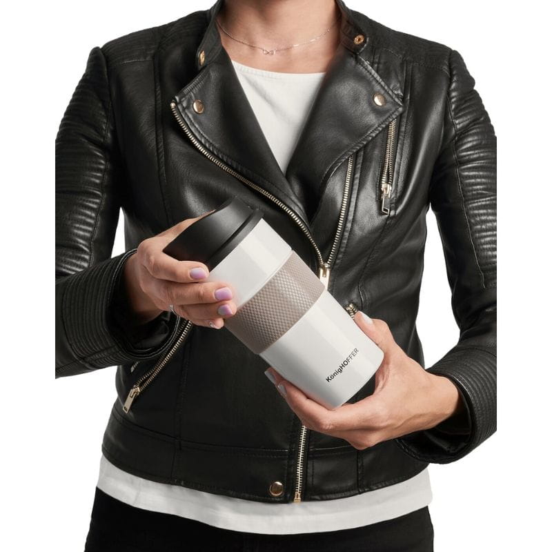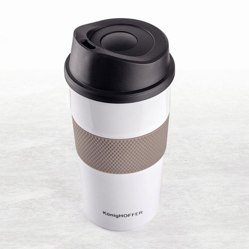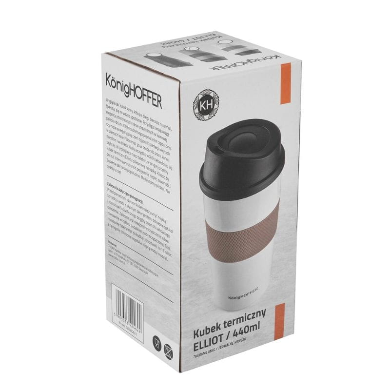 Kubek termiczny KonigHOFFER Elliot 440 ml w kolorze białym to idealny wybór na codzienne podróże, wycieczki czy przerwę w pracy. Dzięki podwójnym ściankom i próżniowej izolacji, napój utrzyma swoją temperaturę przez długi czas – niezależnie czy jest to gorąca kawa, czy zimna lemoniada.