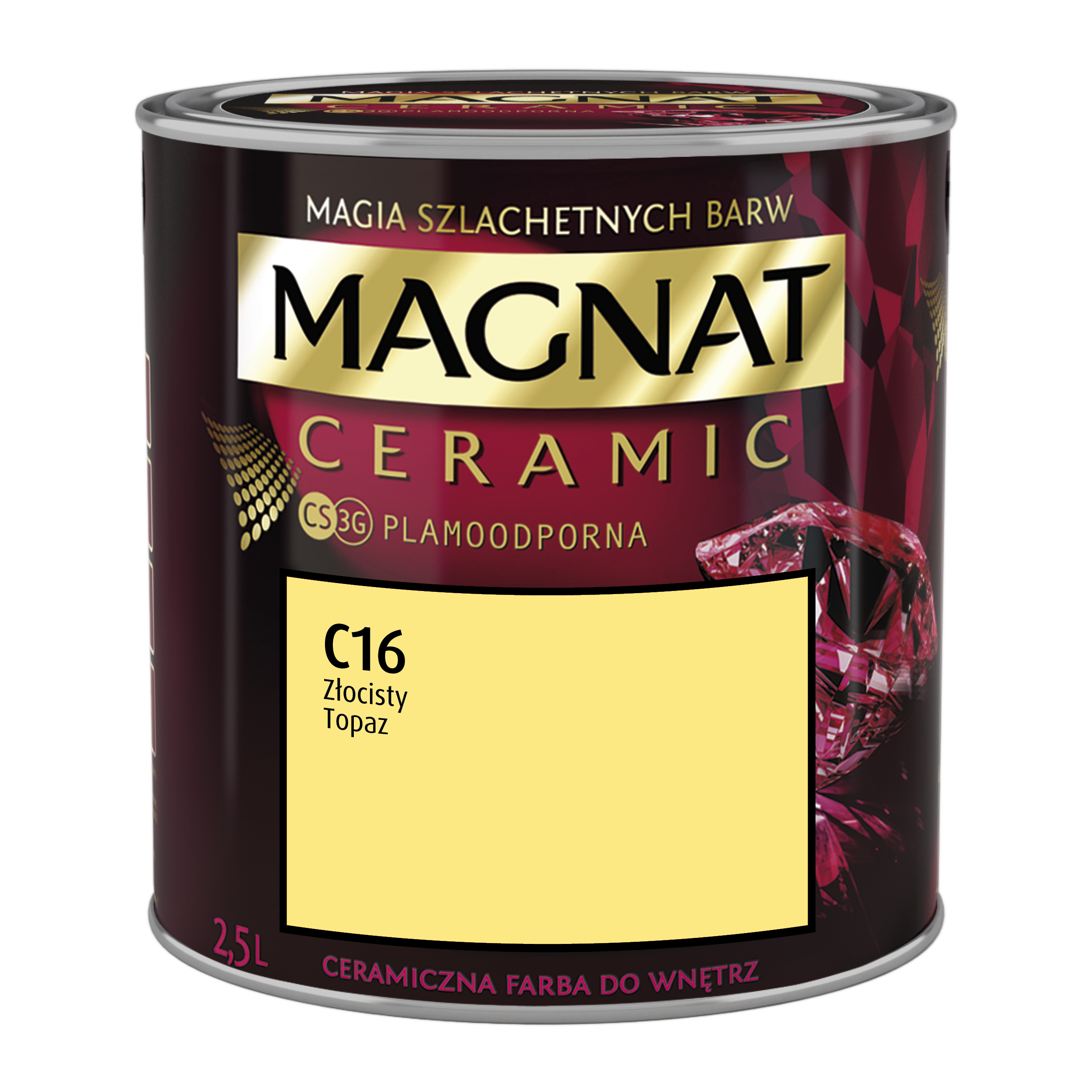 Magnat CERAMIC to farba 3. generacji, którą wyprodukowano z wykorzystaniem innowacyjnej technologii CERAMIC SYSTEM, która bazuje na ceramicznych komponentach oraz najwyższej jakości żywicach i pigmentach. Ta unikalna formuła zapewnia farbie MAGNAT CERAMIC ponadprzeciętne parametry odporności na szorowanie i wielokrotne zmywanie oraz sprawia, że powłoki farby nie absorbują zabrudzeń i szczególnych plam.