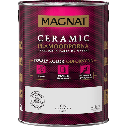 Magnat CERAMIC to farba 3. generacji, którą wyprodukowano z wykorzystaniem innowacyjnej technologii CERAMIC SYSTEM, która bazuje na ceramicznych komponentach oraz najwyższej jakości żywicach i pigmentach. Ta unikalna formuła zapewnia farbie MAGNAT CERAMIC ponadprzeciętne parametry odporności na szorowanie i wielokrotne zmywanie oraz sprawia, że powłoki farby nie absorbują zabrudzeń i szczególnych plam.
