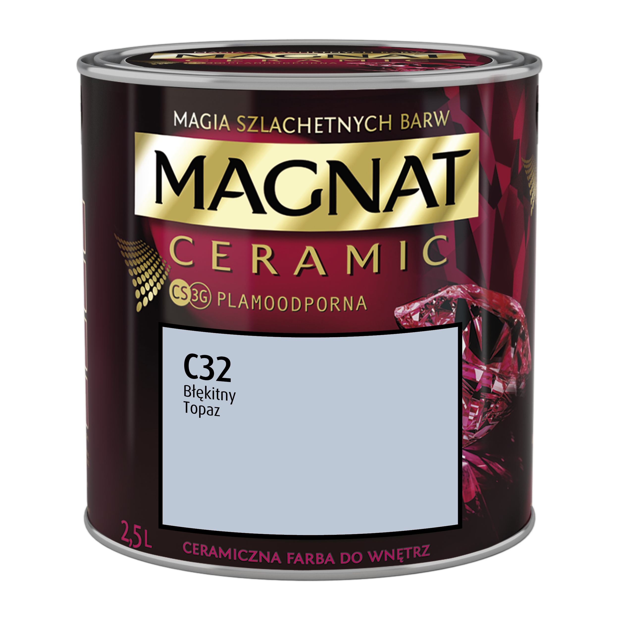 Magnat CERAMIC to farba 3. generacji, którą wyprodukowano z wykorzystaniem innowacyjnej technologii CERAMIC SYSTEM, która bazuje na ceramicznych komponentach oraz najwyższej jakości żywicach i pigmentach. Ta unikalna formuła zapewnia farbie MAGNAT CERAMIC ponadprzeciętne parametry odporności na szorowanie i wielokrotne zmywanie oraz sprawia, że powłoki farby nie absorbują zabrudzeń i szczególnych plam.