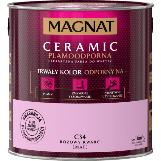 Magnat CERAMIC to farba 3. generacji, którą wyprodukowano z wykorzystaniem innowacyjnej technologii CERAMIC SYSTEM, która bazuje na ceramicznych komponentach oraz najwyższej jakości żywicach i pigmentach. Ta unikalna formuła zapewnia farbie MAGNAT CERAMIC ponadprzeciętne parametry odporności na szorowanie i wielokrotne zmywanie oraz sprawia, że powłoki farby nie absorbują zabrudzeń i szczególnych plam.