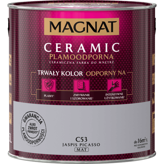 Magnat CERAMIC to farba 3. generacji, którą wyprodukowano z wykorzystaniem innowacyjnej technologii CERAMIC SYSTEM, która bazuje na ceramicznych komponentach oraz najwyższej jakości żywicach i pigmentach. Ta unikalna formuła zapewnia farbie MAGNAT CERAMIC ponadprzeciętne parametry odporności na szorowanie i wielokrotne zmywanie oraz sprawia, że powłoki farby nie absorbują zabrudzeń i szczególnych plam.