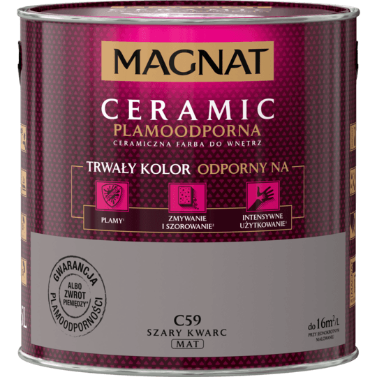 Magnat CERAMIC to farba 3. generacji, którą wyprodukowano z wykorzystaniem innowacyjnej technologii CERAMIC SYSTEM, która bazuje na ceramicznych komponentach oraz najwyższej jakości żywicach i pigmentach. Ta unikalna formuła zapewnia farbie MAGNAT CERAMIC ponadprzeciętne parametry odporności na szorowanie i wielokrotne zmywanie oraz sprawia, że powłoki farby nie absorbują zabrudzeń i szczególnych plam.