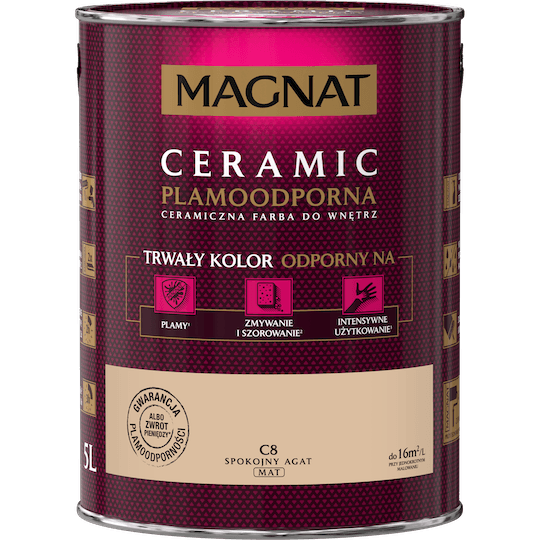 Magnat CERAMIC to farba przeznaczona do dekoracyjno-ochronnego malowania ścian i sufitów wewnątrz pomieszczeń wykonanych z zapraw cementowych, cementowo-wapiennych, gipsowych, cegły, płyt gipsowo-kartonowych, drewnianych, drewnopochodnych oraz tapet, również z włókna szklanego. Ze względu na wyjątkowe właściwości i trwałość farba jest polecana do malowania pomieszczeń szczególnie narażonych na zabrudzenia oraz powierzchni, które wymagają dezynfekcji np. ciągi komunikacyjne, korytarze, pomieszczenia prywatne, biurowe i służby zdrowia, salony i aneksy jadalne.
