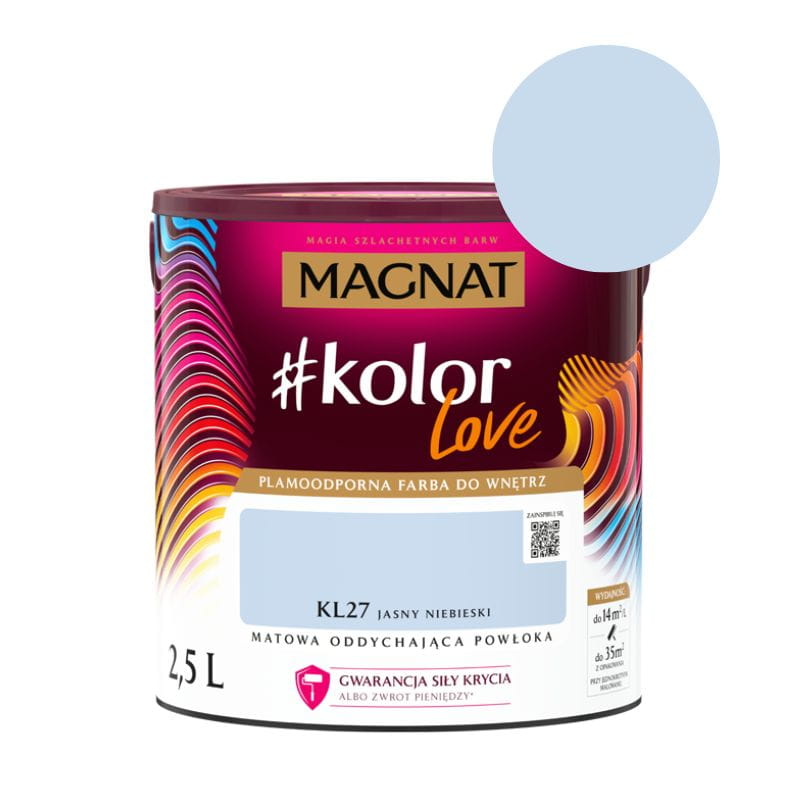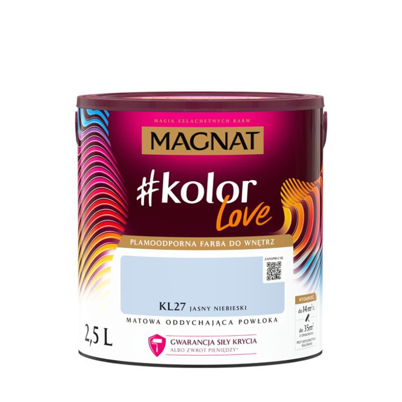 Farba MAGNAT #kolorLove to wyjątkowa farba lateksowa o wysokiej jakości, stworzona z myślą o malowaniu ścian i sufitów wewnątrz pomieszczeń. Jej matowe wykończenie i odporność na plamy, szorowanie oraz wielokrotne zmywanie sprawiają, że idealnie nadaje się do różnych pomieszczeń domu - od salonu i sypialni po kuchnię i korytarz. Dzięki doskonałemu kryciu, możemy zaoferować Ci gwarancję siły krycia.