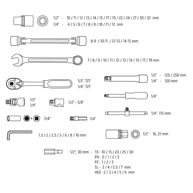 - Nasadki: 13 szt. (rozmiary: 10, 11, 12, 13, 14, 15, 17, 19, 22, 24, 27, 30, 32 mm)