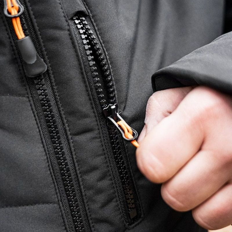 - Kieszeń piersiowa zapinana na suwak – zabezpiecza przedmioty przed wypadnięciem, co jest kluczowe w trakcie pracy.