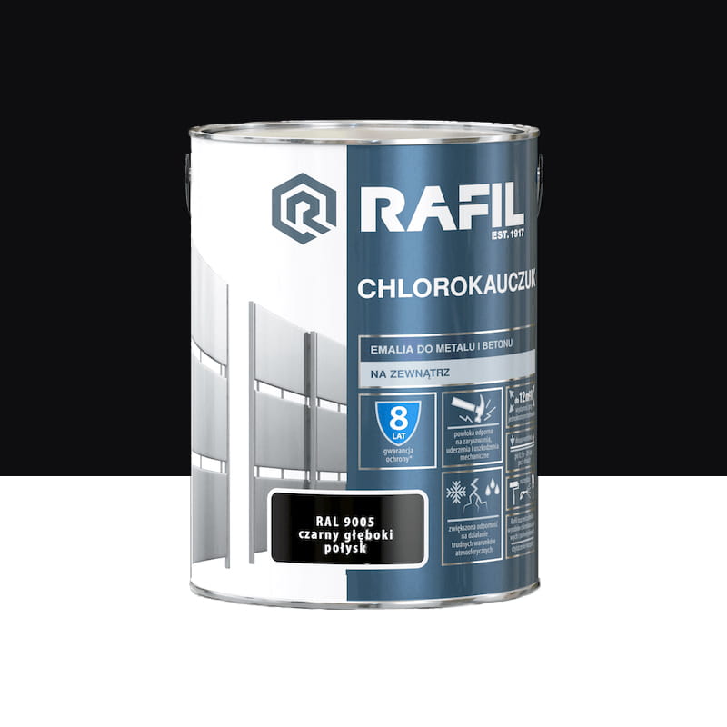 Emalia Rafil CHLOROKAUCZUK przeznaczona jest do ochronno-dekoracyjnego malowania powierzchni stalowych, żeliwnych i betonowych eksploatowanych na zewnątrz pomieszczeń. Tworzy trwałą i elastyczną powłokę, odporną na zarysowania, uderzenia i uszkodzenia mechaniczne. Charakteryzuje się zwiększoną odpornością na działanie trudnych warunków atmosferycznych. Zapewnia długotrwałą ochronę antykorozyjną malowanych powierzchni metalowych w zestawieniu z Rafil PODKŁAD CHLOROKAUCZUKOWY. Podłoża betonowe nie wymagają zastosowania podkładu przed nałożeniem emalii Rafil CHLOROKAUCZUK.