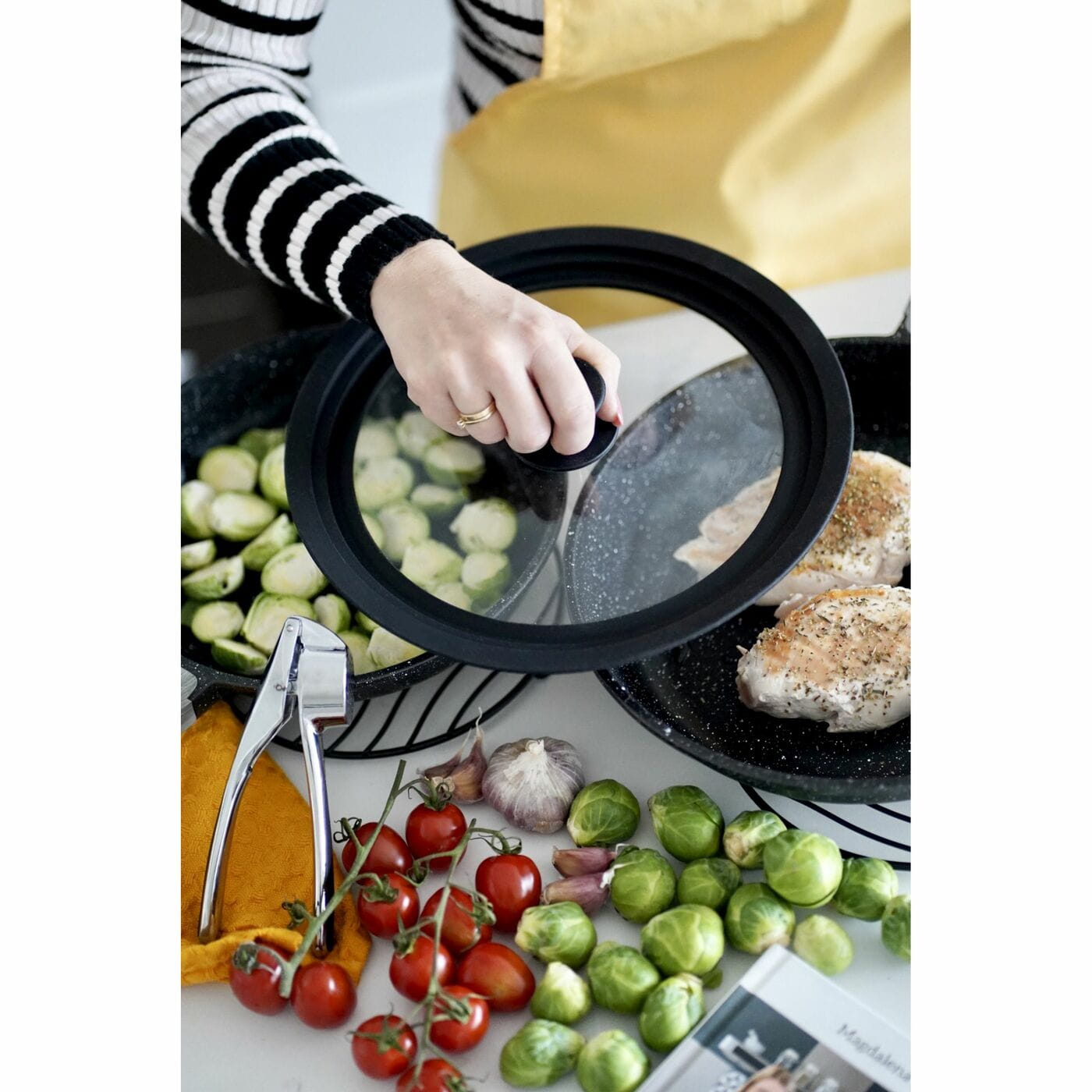 Pokrywka uniwersalna to świetne rozwiązanie, by zaoszczędzić miejsce w kuchni. Pasuje na garnki i patelnie o średnicy: 18, 20 i 22 cm. Pokrywka posiada odpowietrznik oraz silikonowy rant.
