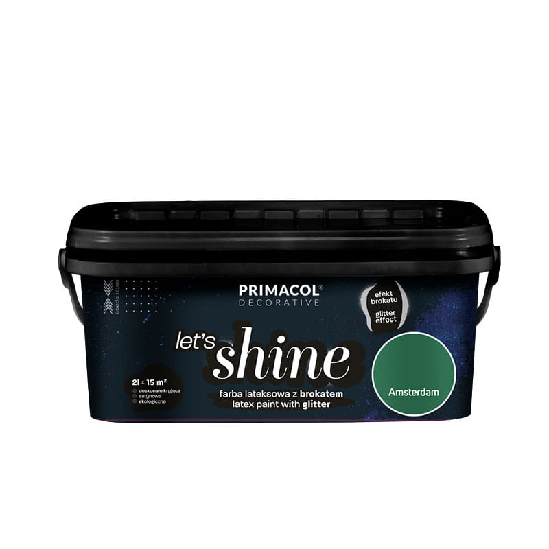 Let’s shine to farba dekoracyjna połyskująca tysiącem srebrzystych drobinek. Uzyskany efekt jest bardzo subtelny, a jego intensywność wzrasta przy dobrym oświetleniu. Produkt przeznaczony jest do malowania ścian i sufitów wewnątrz pomieszczeń. Charakteryzuje się wysoką odpornością na zmywanie i doskonałym kryciem. Farba przeznaczona jest do malowania powierzchni tynków mineralnych i gipsowych, płyt gipsowo-kartonowych, cegieł, powierzchni drewnianych i drewnopochodnych oraz tapet z włókna szklanego.