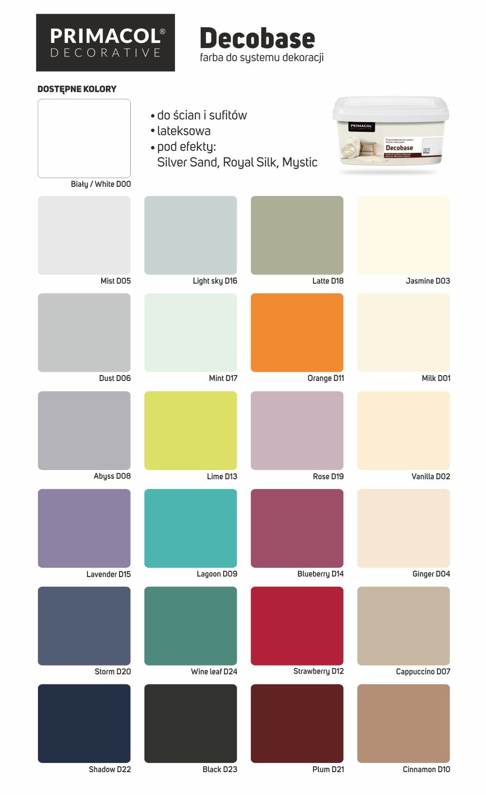 Farba PRIMACOL z serii DECOBASE to produkt przeznaczony do malowania powierzchni tynków mineralnych i gipsowych, płyt G-K, cegieł, powierzchni drewnianych i drewnopochodnych oraz tapet z włókna szklanego. Szczególnie rekomendowana do stosowania jako warstwa podkładowa, aby uzyskać efekty dekoracyjne systemu Primacol Decorative: Silver Sand, Royal Silk, Mystic. Polecana również do efektów wykonywanych przy użyciu Lakieru do spękań i Papieru dekoracyjnego.