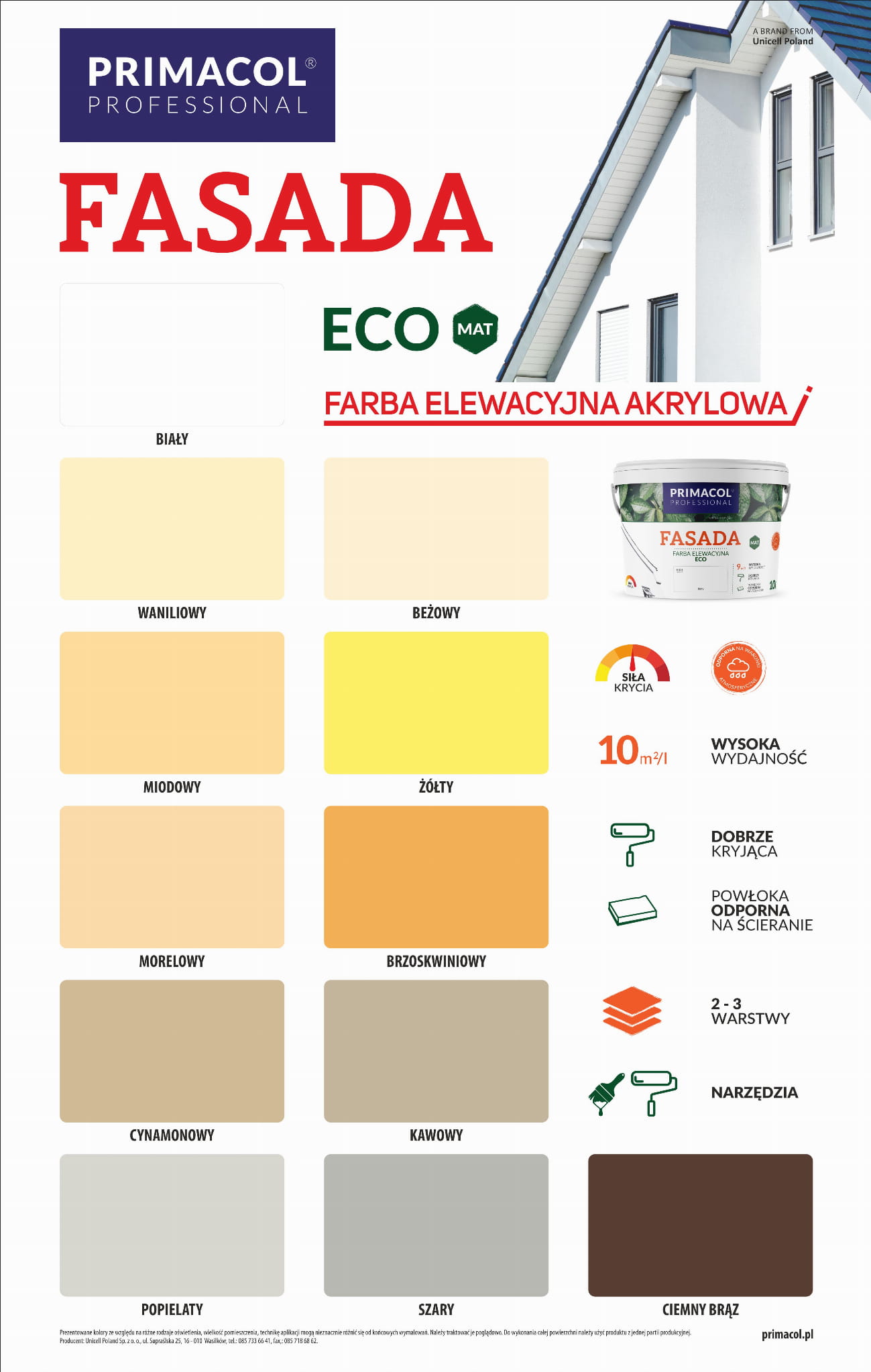 Fasada ECO to akrylowa farba przeznaczona do malowania elewacji budynków. Produkt o dobrej sile krycia, dostępny w różnych wersjach kolorystycznych. Po zaschnięciu tworzy trwałą, matową i paroprzepuszczalną powłokę o znacznej odporności na działanie warunków atmosferycznych. Do stosowania na tynkach cementowych, cementowo-wapiennych, gipsowych i innych podłożach mineralnych. Nadaje się również do malowania ścian wewnątrz pomieszczeń.