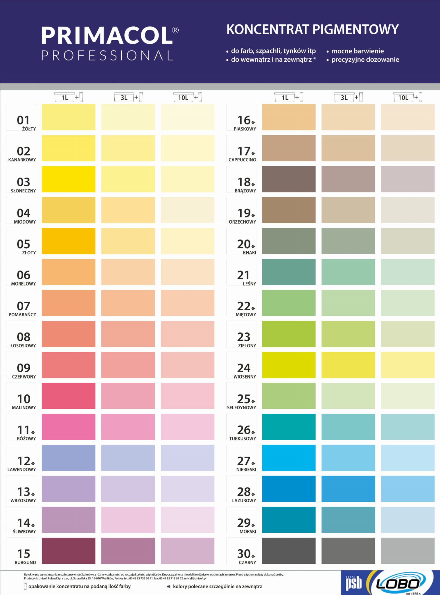 Pigment Primacol to wysokowydajny uniwersalny koncentrat do barwienia wyrobów wodorozcieńczalnych. Szeroka gama kolorów pozwala na dobranie idealnego koloru, ponadto możliwe jest mieszanie różnych kolorów ze sobą.