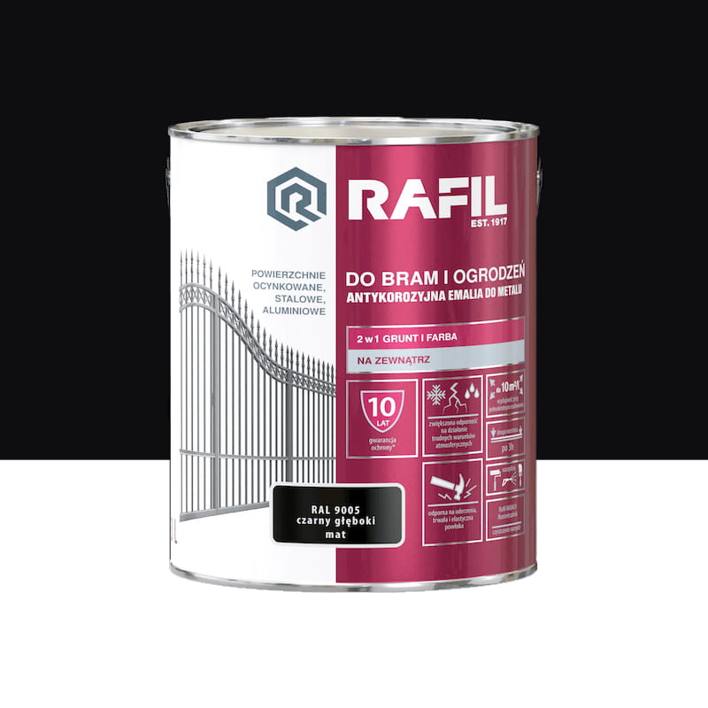 Antykorozyjna Emalia RAFIL DO BRAM I OGRODZEŃ przeznaczona jest do ochronno-dekoracyjnego malowania powierzchni metalowych: stalowych, ocynkowanych i aluminiowych eksploatowanych na zewnątrz pomieszczeń. Tworzy trwałą i elastyczną powłokę odporną na uderzenia. Charakteryzuje się zwiększoną odpornością na działanie trudnych warunków atmosferycznych. Zapewnia długotrwały efekt dekoracyjny malowanych powierzchni, a w zestawieniu z Rafil PODKŁAD ANTYKOROZYJNY stanowi silne zabezpieczenie przed korozją