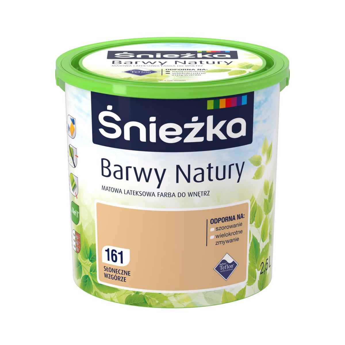 Śnieżka Lateksowa Barwy Natury to wyjątkowa farba do stosowania wewnątrz obiektów - do jej produkcji wykorzystano innowacyjną technologię oraz najwyższej jakości żywice i pigmenty. Fenomenalna i oryginalna formuła pozwala na stworzenie niezwykle trwałych powłok, które umożliwiają utrzymanie perfekcyjnego wyglądu i koloru ścian. Wysoka odporność na mycie i szorowanie sprawia, że z pomalowanych powierzchni można bardzo łatwo usunąć plamy i zabrudzenia.