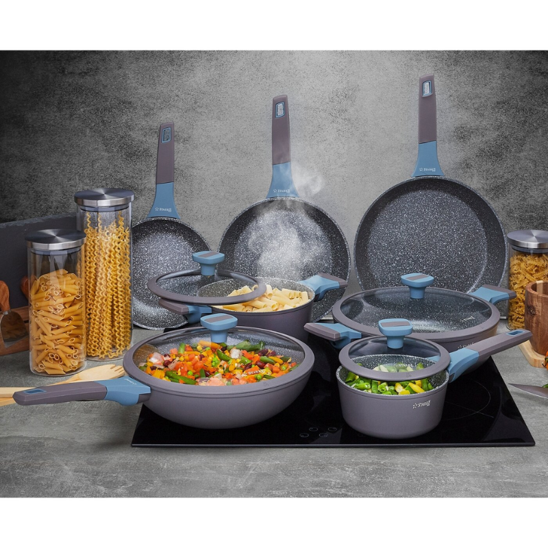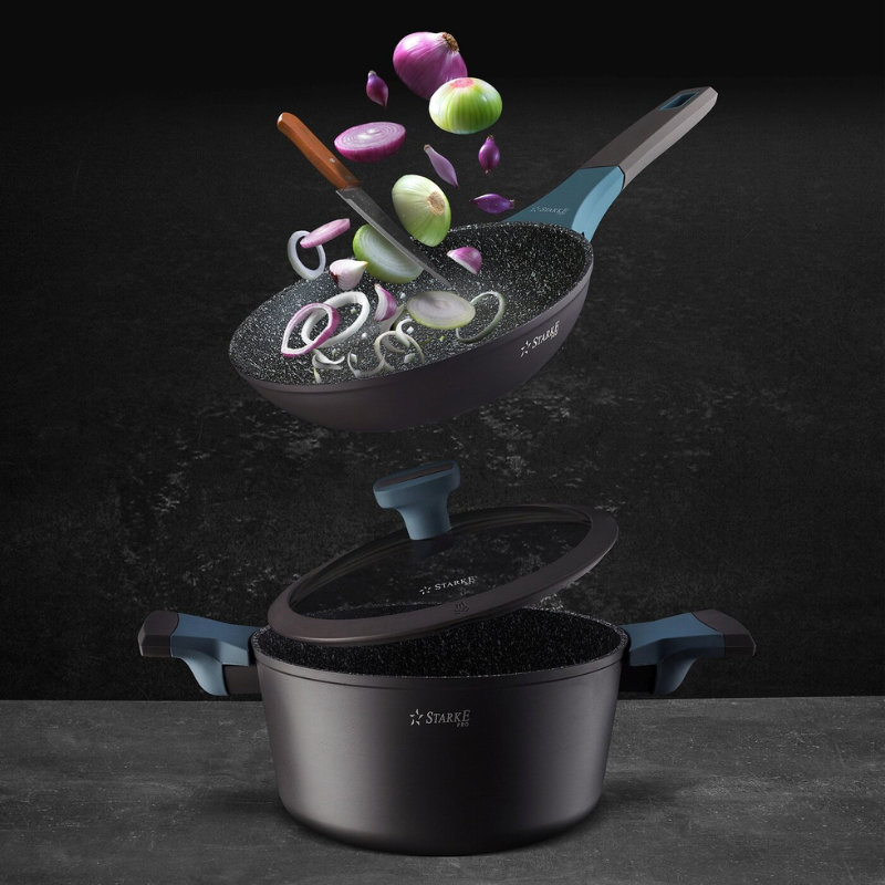 Patelnia marmurowa Starke Pro Luxury Grey to doskonały wybór dla osób ceniących wysoką jakość i trwałość w kuchni. Wykonana z aluminium metodą forged, zapewnia równomierne rozprowadzanie ciepła oraz doskonałą odporność na odkształcenia termiczne. Dzięki pełnemu dnu indukcyjnemu patelnia błyskawicznie się nagrzewa, oszczędzając nawet 40% energii w porównaniu do standardowych modeli. Można ją stosować na każdym typie kuchenki, w tym na indukcji, co czyni ją wszechstronnym narzędziem w codziennym gotowaniu.