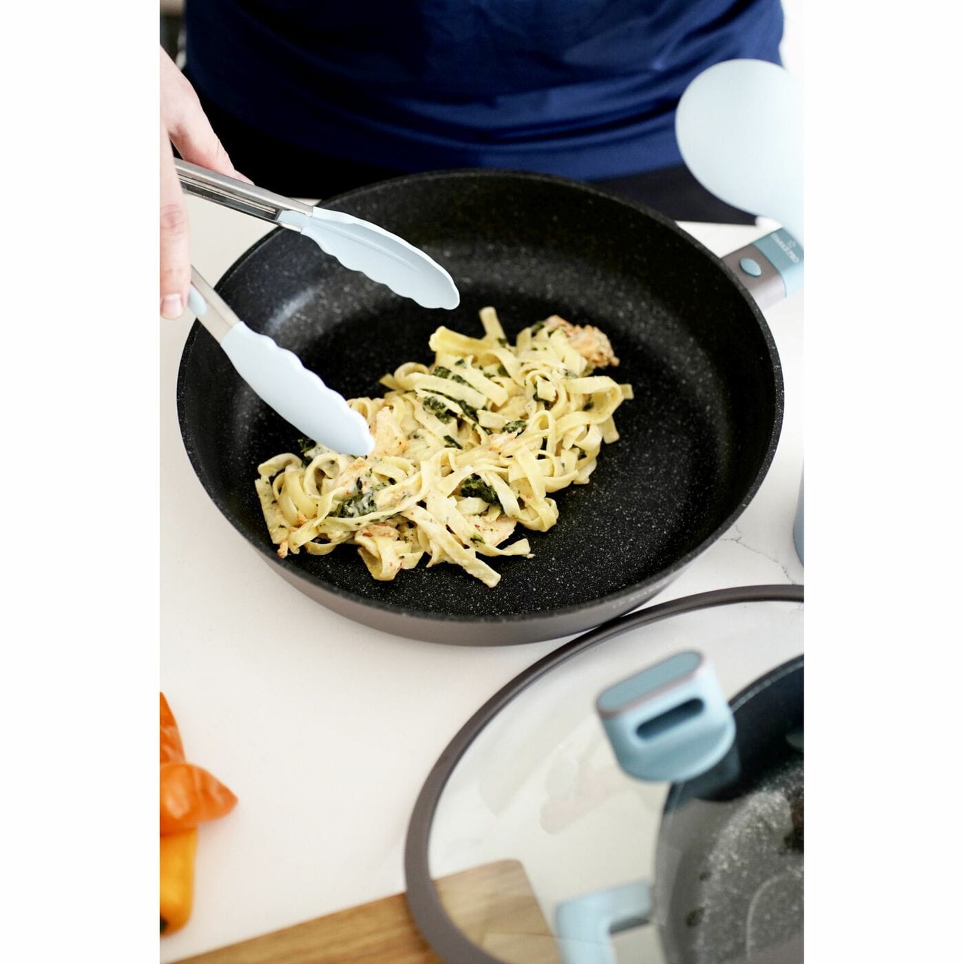 - zewnętrzna część patelni pokryta jest żaroodporną, silikonową powłoką