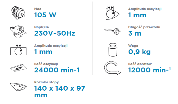 Szlifierka oscylacyjna stopa delta 105W, stopa 140x140x97 mm, obroty 12000 min⁻¹, oscylacje 24000 min⁻¹, amplituda oscylacji 1 mm, papier ścierny 140 x 140 x 97 mm, wymiary urządzenia (LxH) 160 x 125 mm, masa 0.87 kg, akcesoria: 12 papierów ściernych, króciec przyłączeniowy