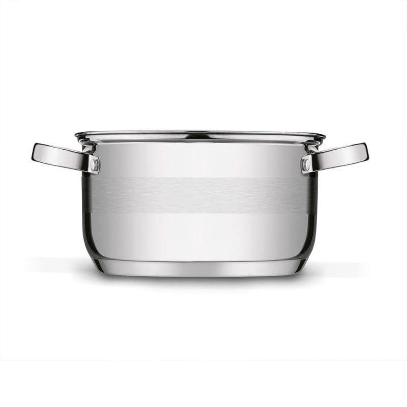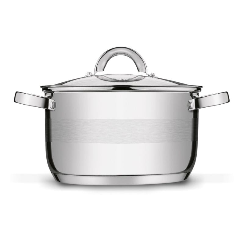 Pozostałe informacje: garnek ze stali nierdzewnej wykończony satynowym pasem; wysokość garnka bez pokrywki: 15 cm; uchwyty garnka i pokrywki nitowane.
