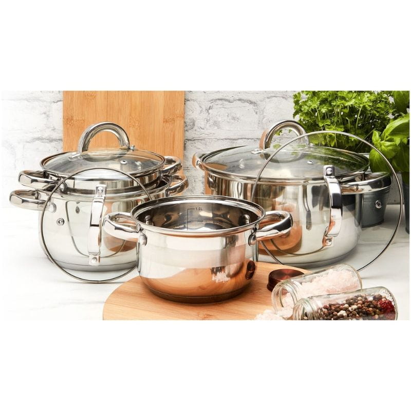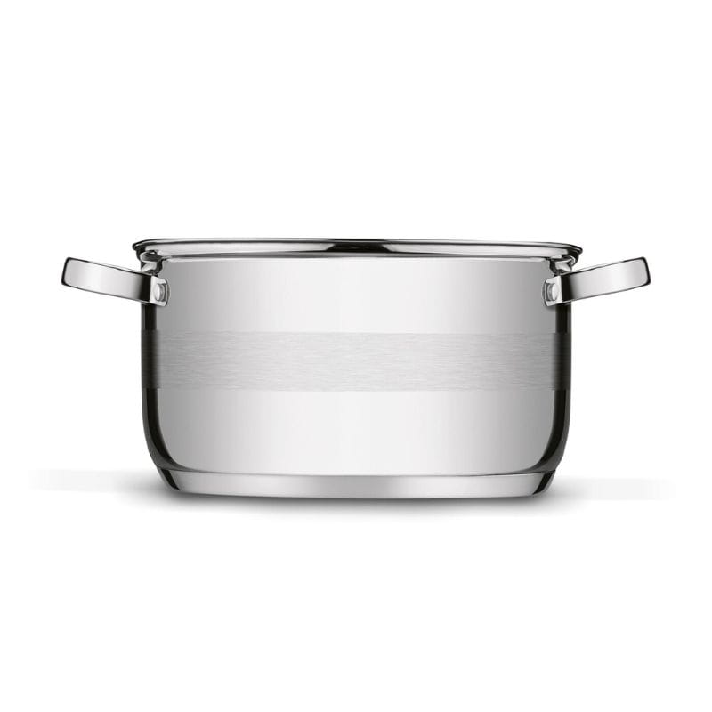 Pozostałe informacje: garnek ze stali nierdzewnej wykończony satynowym pasem; wysokość garnka bez pokrywki: 15,5 cm; uchwyty garnka i pokrywki nitowane.