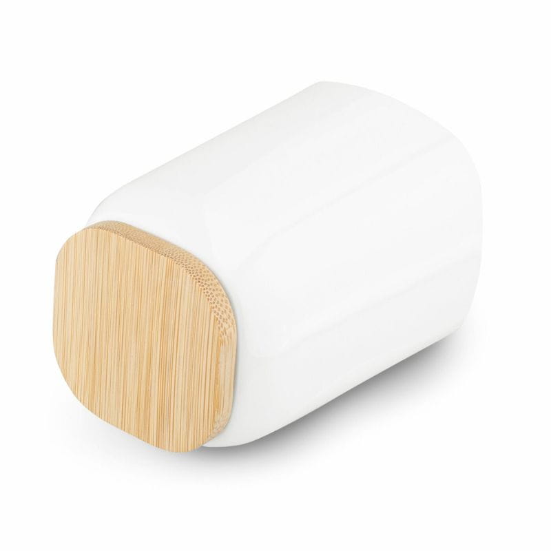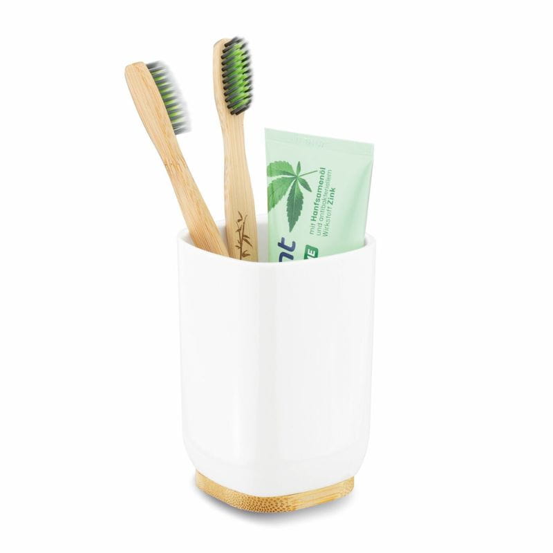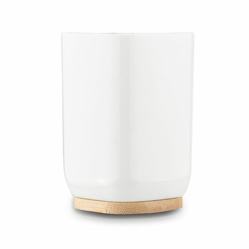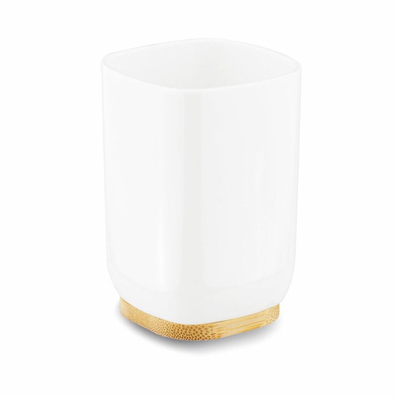 Zbudowany z białego tworzywa sztucznego i drewna bambusowego, kubek jest trwały, łatwy w pielęgnacji i poręczny. Drewniana podstawa zapewnia stabilność ustawienia na brzegu umywalki, co sprawia, że będzie niezawodnym towarzyszem w codziennych czynnościach higienicznych.