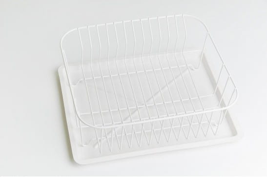Biała, metalowa suszarka do naczyń, idealnie pasująca do komory zlewu kuchennego.