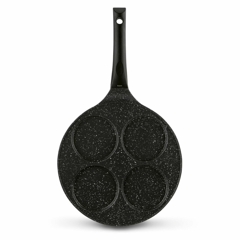 Tadar Patelnia marmurowa do pancakes i placków Marble o średnicy 26 cm to doskonałe narzędzie do przygotowywania różnorodnych śniadań i przekąsek. Dzięki czterem równym, okrągłym zagłębieniom, patelnia umożliwia jednoczesne smażenie aż czterech placuszków, pancakes lub jajek sadzonych, co czyni ją idealnym wyborem na szybkie i smaczne posiłki dla całej rodziny.
