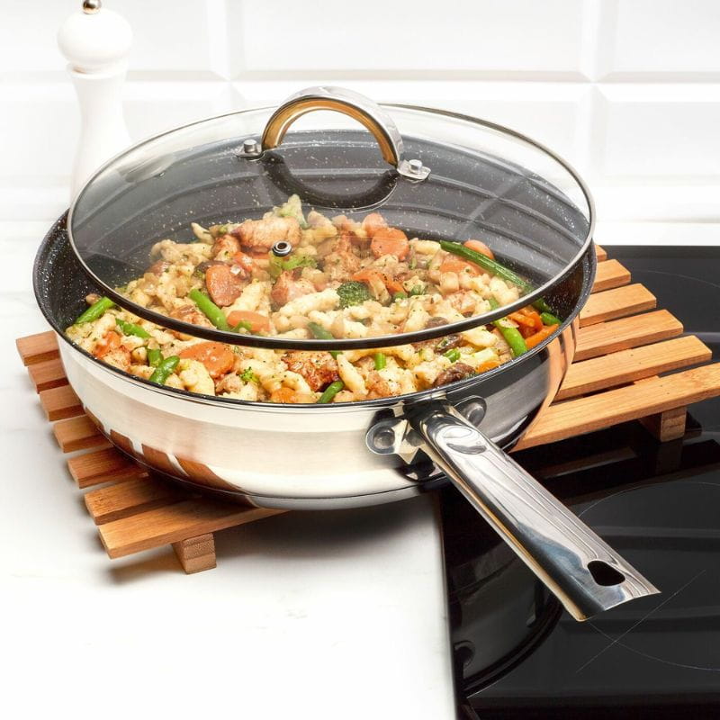 Patelnia jest energooszczędna, idealna do smażenia na każdej kuchence, w tym indukcyjnej, a jej głęboki korpus zapewnia wygodę przy mieszaniu i smażeniu różnych składników. Dodatkowo, w zestawie znajduje się szklana pokrywka z odpowietrznikiem, który kontroluje parowanie, oraz stalowa nitowana rączka, która zapewnia komfort i stabilność podczas przenoszenia naczynia. To idealne naczynie do codziennych posiłków oraz do przygotowywania dań na większą skalę, w tym duszonych potraw.