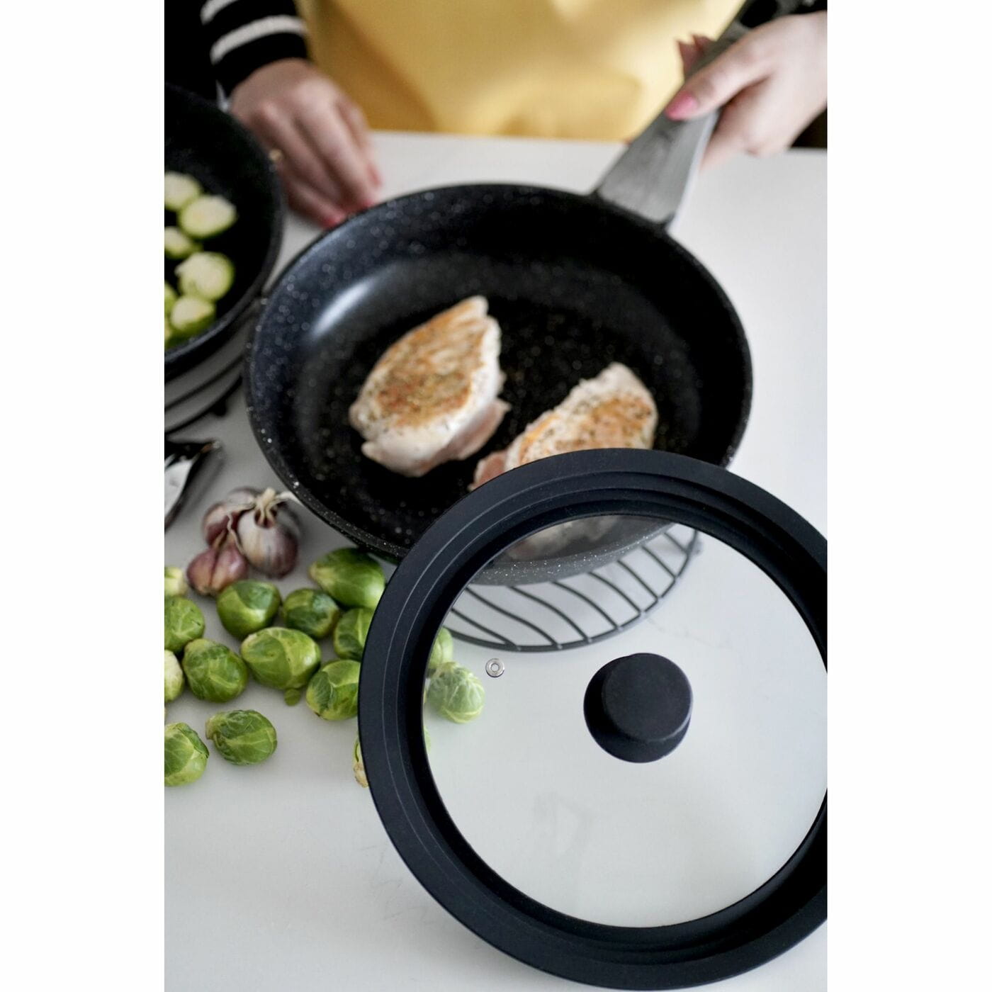- silikonowy rant pozwala pokrywce stabilnie utrzymać się na patelni lub garnku