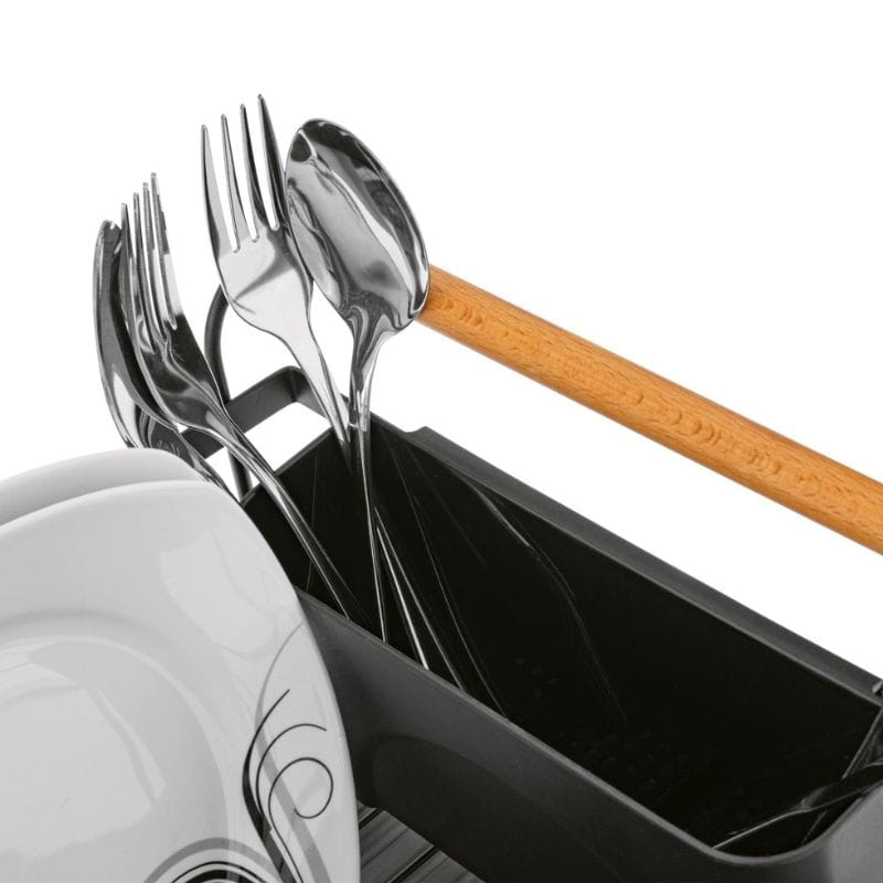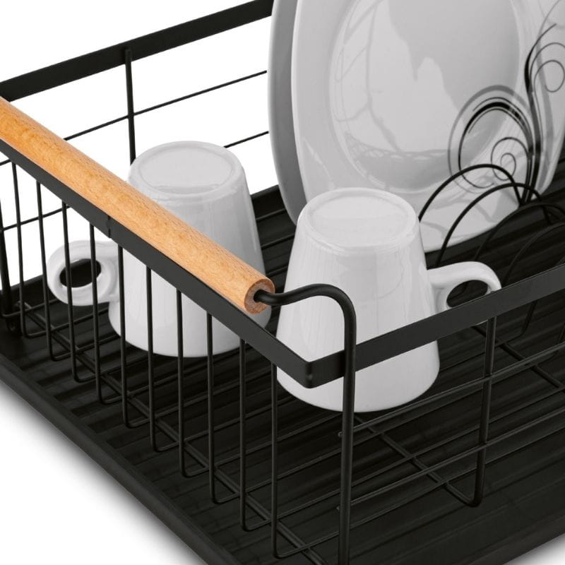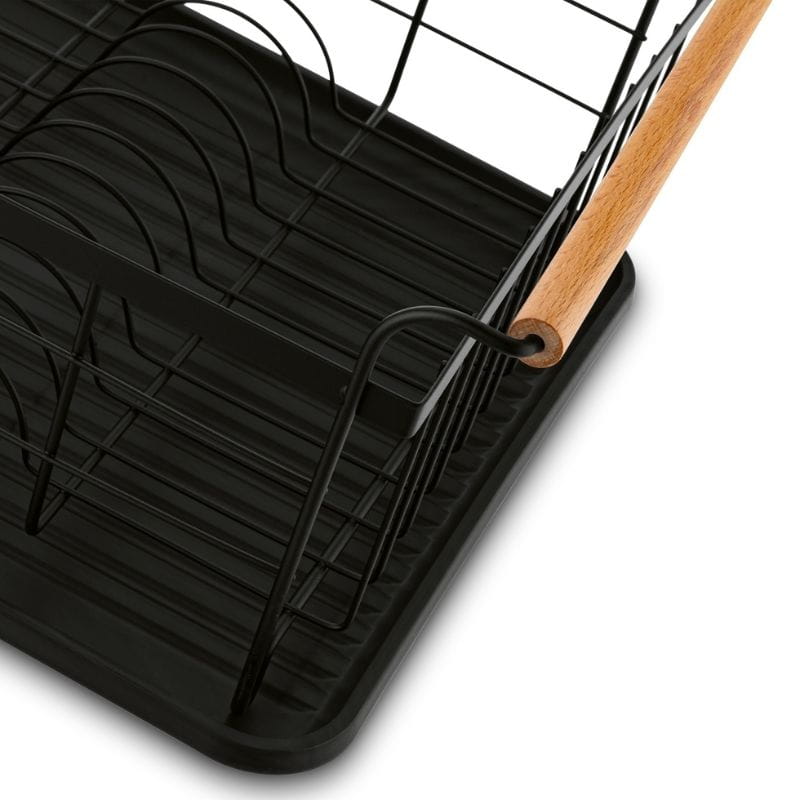 Solidna stalowa konstrukcja suszarki, zabezpieczona malowaniem proszkowym, gwarantuje odporność na działanie wody i długotrwałą wytrzymałość. Dodatkowo, drewniane uchwyty umożliwiają wygodne przenoszenie suszarki wraz z naczyniami. Model posiada także praktyczny ociekacz na sztućce, wykonany z tworzywa sztucznego, co zapewnia dodatkowe miejsce na mokre sztućce po posiłku.