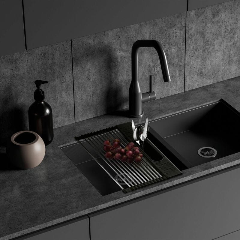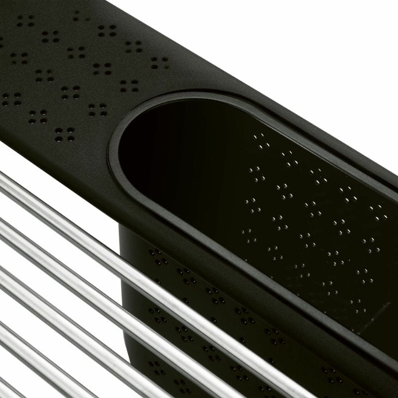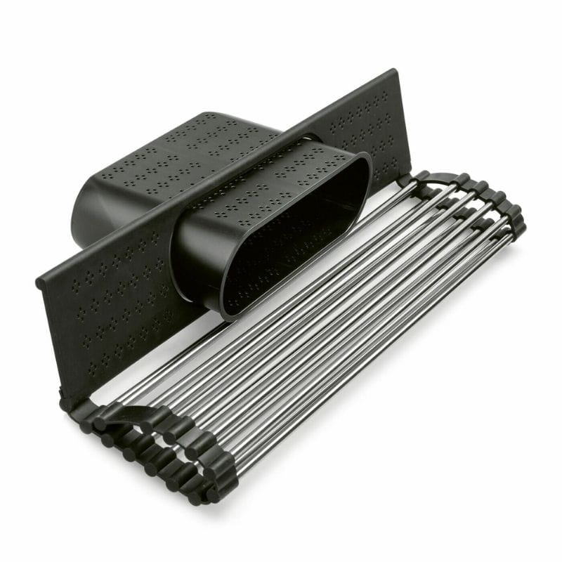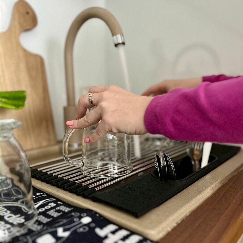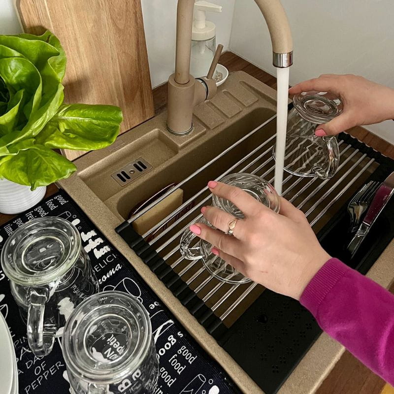 Ta metalowa suszarka wyróżnia się możliwością zwijania, co sprawia, że jest wyjątkowo łatwa w przechowywaniu. Gdy nie jest używana, zwinięta konstrukcja zajmuje minimalną przestrzeń, co jest szczególnie praktyczne w małych kuchniach. Jednak suszarka Tadar Roll Up to nie tylko narzędzie do suszenia naczyń. Jej uniwersalna konstrukcja umożliwia także umieszczenie jej na brzegach komory zlewozmywaka, gdzie stanowi doskonałe miejsce do ociekania warzyw i owoców po umyciu. Elastyczne wykończenie brzegów zapobiega przesuwaniu się suszarki, gwarantując stabilność podczas korzystania.