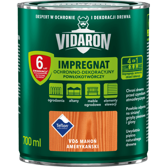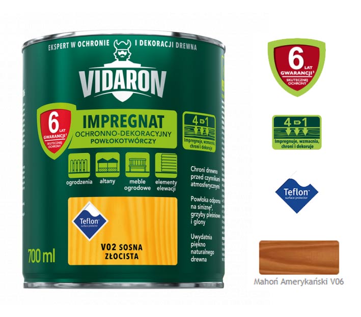 Impregnat Powłokotwórczy do ochronno-dekoracyjnego malowania drewna na zewnątrz i wewnątrz pomieszczeń. Uwydatnia piękno naturalnego drewna, impregnuje, wzmacnia i chroni je przed niszczącymi warunkami atmosferycznymi. Dodatkowo tworzy na powierzchni drewna ochronną powłokę odporną na biokorozję - siniznę, grzyby pleśniowe oraz glony. W połączeniu z bezbarwnym Impregnatem Ochronnym VIDARON zapewnia pełną ochronę drewna.