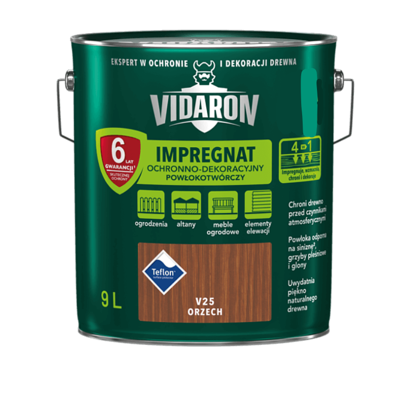Vidaron Impregnat Ochronno-Dekoracyjny Powłokotwórczy w kolorze Orzech V25 to zaawansowany preparat przeznaczony do ochrony i dekoracji drewna zarówno wewnątrz, jak i na zewnątrz pomieszczeń. Dzięki innowacyjnej formule z dodatkiem Teflon™ Surface Protector, zapewnia skuteczną barierę przed wilgocią, promieniowaniem UV oraz biokorozją, jednocześnie podkreślając naturalne piękno drewna.