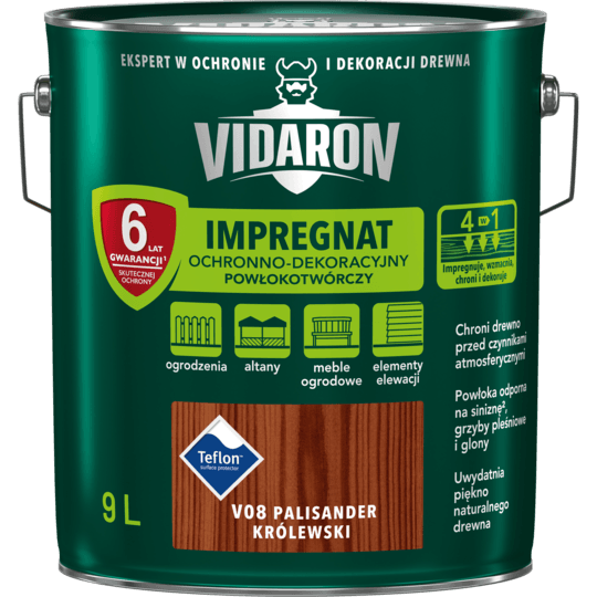 Impregnat Powłokotwórczy do ochronno-dekoracyjnego malowania drewna na zewnątrz i wewnątrz pomieszczeń. Uwydatnia piękno naturalnego drewna, impregnuje, wzmacnia i chroni je przed niszczącymi warunkami atmosferycznymi. Dodatkowo tworzy na powierzchni drewna ochronną powłokę odporną na biokorozję - siniznę, grzyby pleśniowe oraz glony. W połączeniu z bezbarwnym Impregnatem Ochronnym VIDARON zapewnia pełną ochronę drewna.