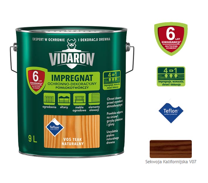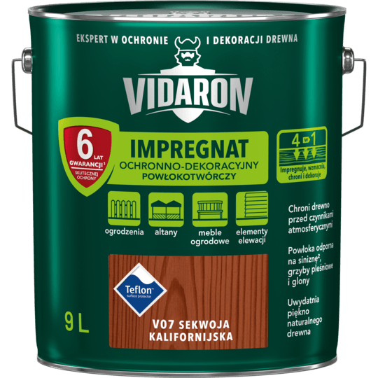 Vidaron Impregnat Ochronno-Dekoracyjny Powłokotwórczy w kolorze Sekwoja Kalifornijska V07 to zaawansowany preparat przeznaczony do ochrony i dekoracji drewna zarówno wewnątrz, jak i na zewnątrz pomieszczeń. Dzięki innowacyjnej formule z dodatkiem Teflon™ Surface Protector, zapewnia skuteczną barierę przed wilgocią, promieniowaniem UV oraz biokorozją, jednocześnie podkreślając naturalne piękno drewna.