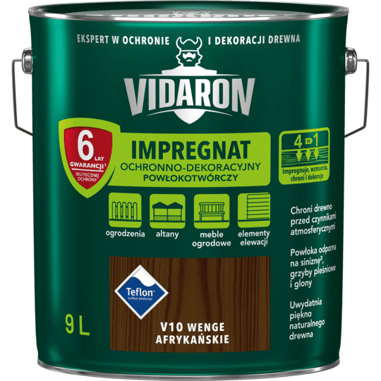 Vidaron Impregnat Ochronno-Dekoracyjny Powłokotwórczy w kolorze Wenge Afrykańskie V10 to zaawansowany preparat przeznaczony do ochrony i dekoracji drewna zarówno wewnątrz, jak i na zewnątrz pomieszczeń. Dzięki innowacyjnej formule z dodatkiem Teflon™ Surface Protector, zapewnia skuteczną barierę przed wilgocią, promieniowaniem UV oraz biokorozją, jednocześnie podkreślając naturalne piękno drewna.