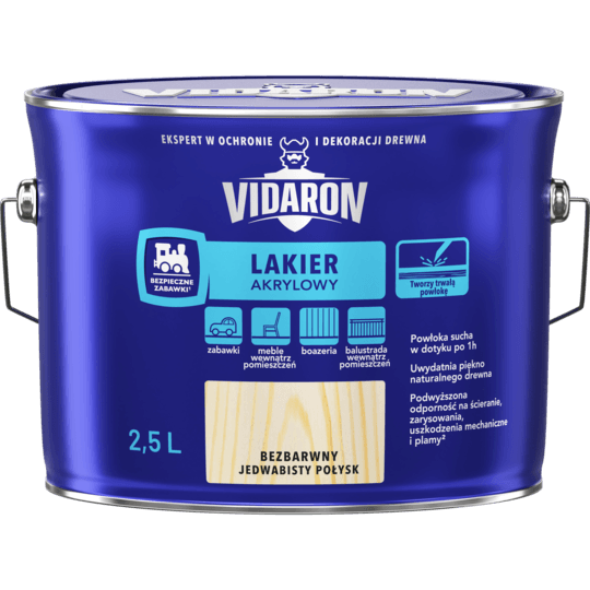 Lakier Akrylowy Vidaron to szybkoschnący preparat o niedrażniącym zapachu. Mający zastosowanie do ochrony i dekoracji drewnianych mebli, boazerii, balustrad i zabawek. Szczególnie wykorzystywany jest do lakierowania zabawek – spełnia surowe wymagania europejskiej normy PN EN 71.3 (Bezpieczeństwo Zabawek). Lakier Akrylowy Vidaron zawiera inhibitory tanin – dzięki temu zabezpiecza drewno przed przebarwieniami, powstającymi wskutek działania żywic i garbników zawartych w drewnie.