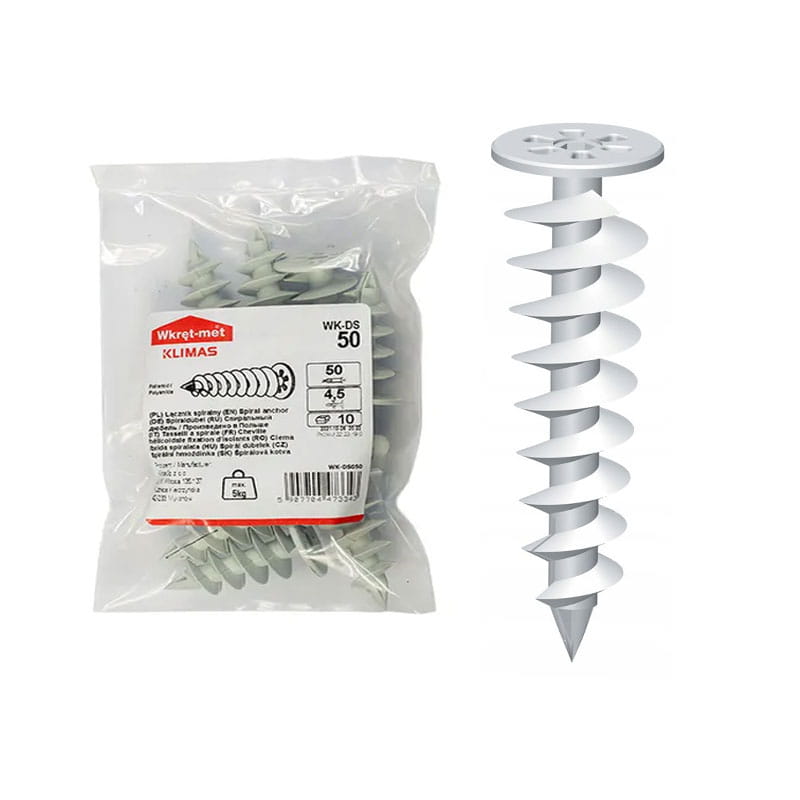 Wkręty spiralne tworzywowe do montażu w styropianie WK-DS przeznaczone są do mocowania lekkich elementów niekonstrukcyjnych (max. do 5 kg/szt.) do elewacji ścian wykonanych ze styropianu. Zalecane do mocowania takich elementów jak: szyldy, nr domów, skrzynki na listy, elementy oświetlenia, czujki ruchu itp. Łączniki wkręcane pozwalają zachować ciągłość termoizolacji w punkcie mocowania, brak mostków cieplnych. Łączniki wykonane są z wysokiej jakości poliamidu co gwarantuje odporność na zmienne warunki atmosferyczne. Łączniki są mocowane wraz z wkrętem o średnicy 4,5 mm. Łączniki nie są przeznaczone do wykonywania zamocowań konstrukcyjnych lub narażonych na znaczne siły dynamiczne (okiennice, żaluzje, markizy okienne itp.).