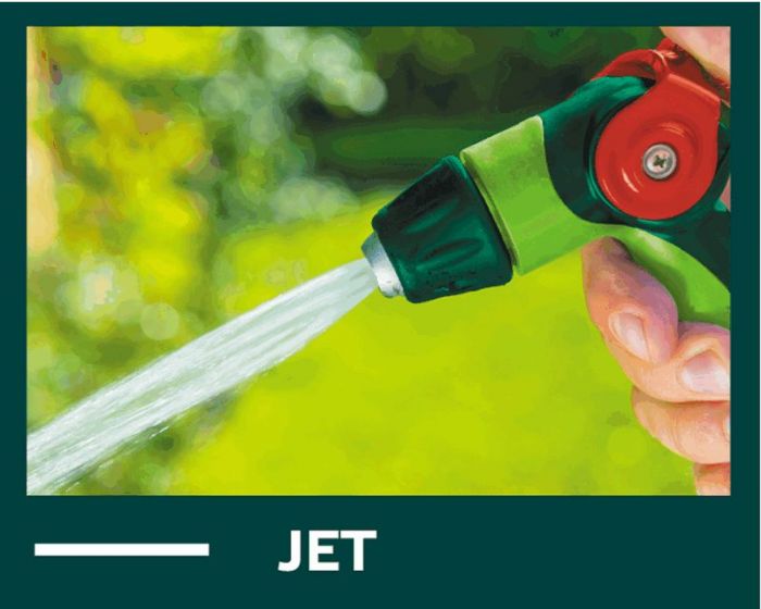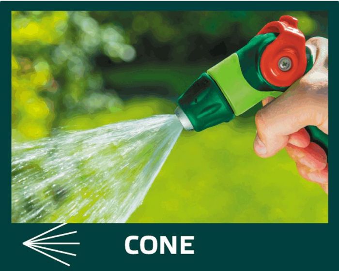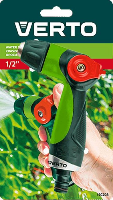 Zraszacz pistoletowy VERTO (nr ref. 15G703) z płynna regulacją strumienia za pomocą kciuka. Regulowana głowica umożliwia ustawienie kształtu strumienia wody od mgiełki do silnego strumienia punktowego. Uchwyt o ergonomicznym kształcie dobrze leży w dłoni i nie wyślizguje się, co podnosi komfort pracy.